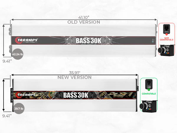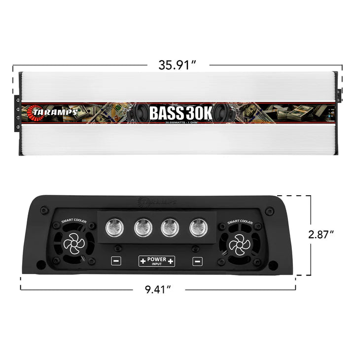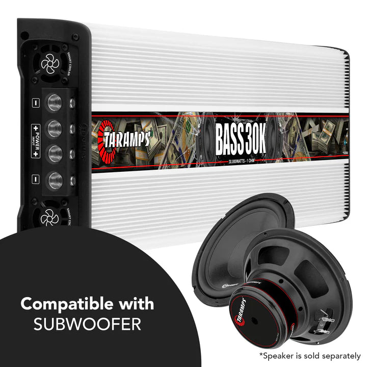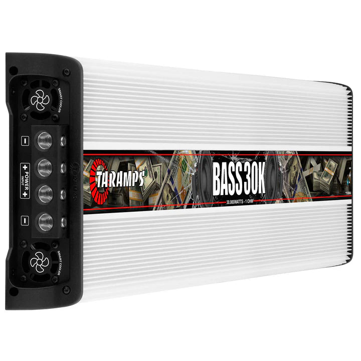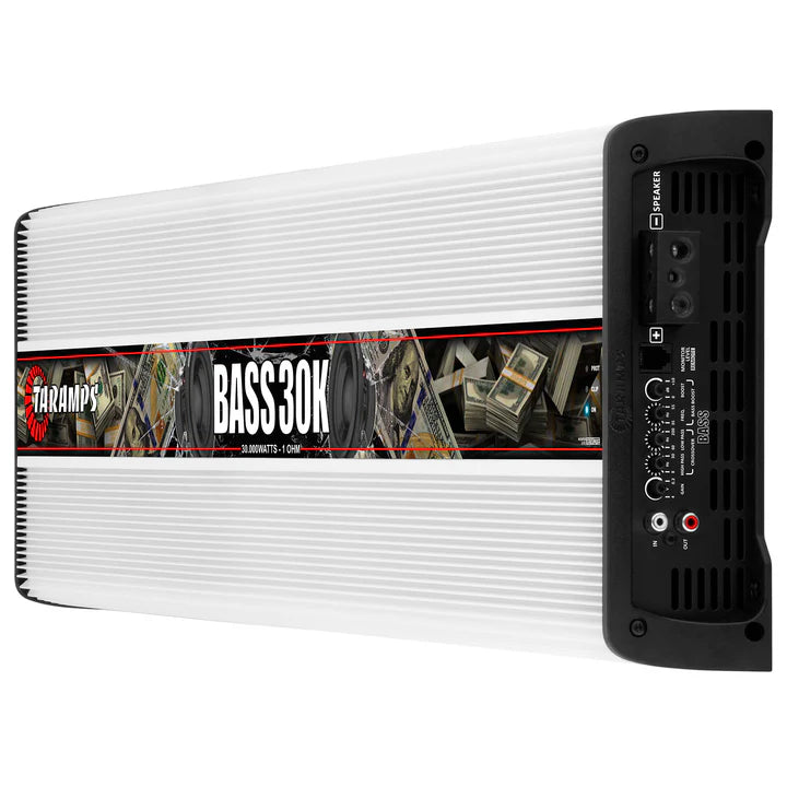 Home / Shop / Amplifiers / Taramps BASS 30k Car Audio Amplifier Rated 0 out of 5 stars0 ReviewsClick to scroll to reviews 30000 Watts Taramps BASS 30k Car Audio Amplifier $2,799 $1,999 Sold out Upgrade your car audio system with the Taramps Bass 30K, a high-performance Monoblock amplifier engineered to deliver 30000W RMS @ 1 ohm. Built for subwoofer applications, this powerhouse amp is the ultimate choice for SPL competitions, hair trick builds, and serious basshead setups. With a wide frequency response of 8Hz to 200Hz, the Bass 30K ensures ultra-deep, clean bass with maximum impact and sound pressure. Whether you’re building a show car or dominating the decibel meter, this amp delivers the performance and reliability Taramps is known for. Designed with precision and control in mind, the Bass 30K features a built-in adjustable crossover with High Pass (8Hz–30Hz) and Low Pass (60Hz–200Hz) filters, allowing you to fine-tune your low-frequency response. The Bass Boost function, adjustable between 35Hz and 55Hz, offers up to +10dB of gain, enhancing sub-bass impact for deep, resonant lows. IMPEDANCE 1 OHM EFFICIENCY 90% RANGE 8Hz to 250Hz 1 Sold out 30 DAY RETURN POLICY 1 YEAR WARRANTY USA FREE SHIPPING Specs & Downloads Recommended Products Reviews Recently Viewed THE BASS 30K Key Features: Massive 30000W RMS @ 1 ohm for extreme bass Wide frequency response: 8Hz to 200Hz Adjustable crossover: High Pass & Low Pass filters Bass Boost: +10dB at selectable frequencies Variable gain control: 0.2V to 4V for flexible signal matching RCA inputs/outputs for easy system expansion Compatible with Taramps accessories: Monitor Level Remote, M1 LED Monitor, Bass Control, EQ Bass, and more Dual power inputs for 70mm² (2/0 AWG) cables Speaker outputs support up to 10mm² (7 AWG) wiring Whether you’re building a show-stopping demo vehicle or chasing SPL records, the Taramps Bass 30K amplifier delivers unmatched power, control, and reliability. Built for high-current systems and total customization, it’s more than just an amp—it’s the heart of your high-performance car audio setup.