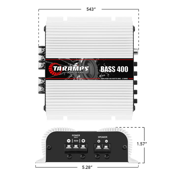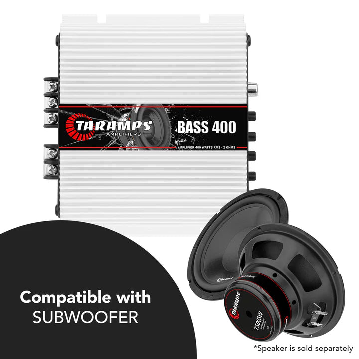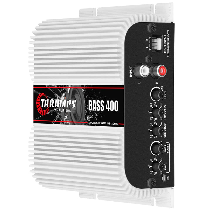 - The Bass 400 amplifier delivers exceptional performance and versatility with 400 Watts RMS output at 1, 2, or 4 Ohms. Its compact design features both RCA and high-level inputs.