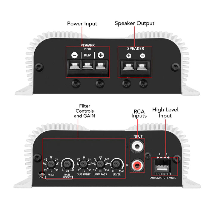 The amplifier has wire input and an RCA input for the signals to be amplified. Comes with LEVEL, LOW PASS and SUBSONIC adjustments for amplifier sensitivity and frequency and BASS BOOST with Freq. for sub-bass reinforcement.