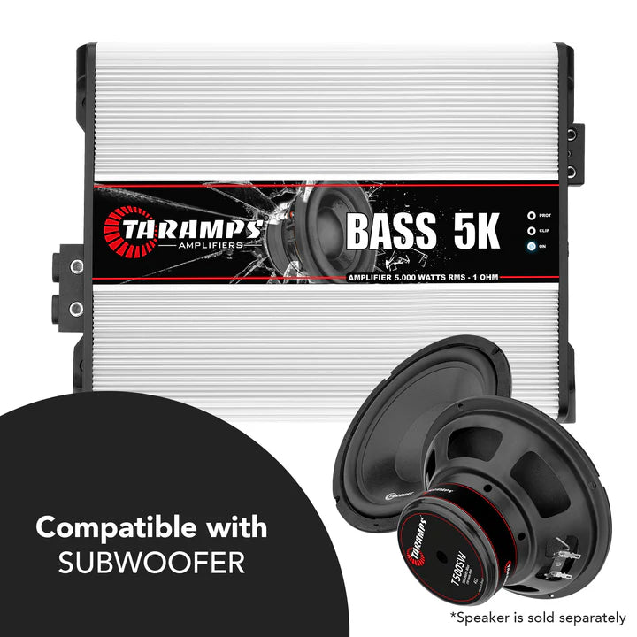 The primary function of the Taramps Bass 5K is to provide up to 5000 watts RMS of power, specifically designed to drive subwoofers and produce deep, impactful bass. It operates efficiently at 1 ohm, delivering high power for loud, clear, and punchy bass performance in vehicles.
