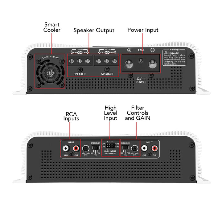 The DS 4000×4 is a 4000W amplifier with 4x1000W RMS channels that can bridge, featuring high-level input and compatibility with most head units. Includes RCA, Gain, and fixed Crossover for enhanced sound across all music styles.