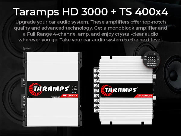 Upgrade your car audio system with the Taramps HD 3000 1 OHM + TS 400x4 2 OHM Amplifier Combo. Experience powerful, crystal-clear sound with 3000W RMS for bass and 4-channel versatility for mids and highs. Designed for durability, efficiency, and top-tier performance in any setup.