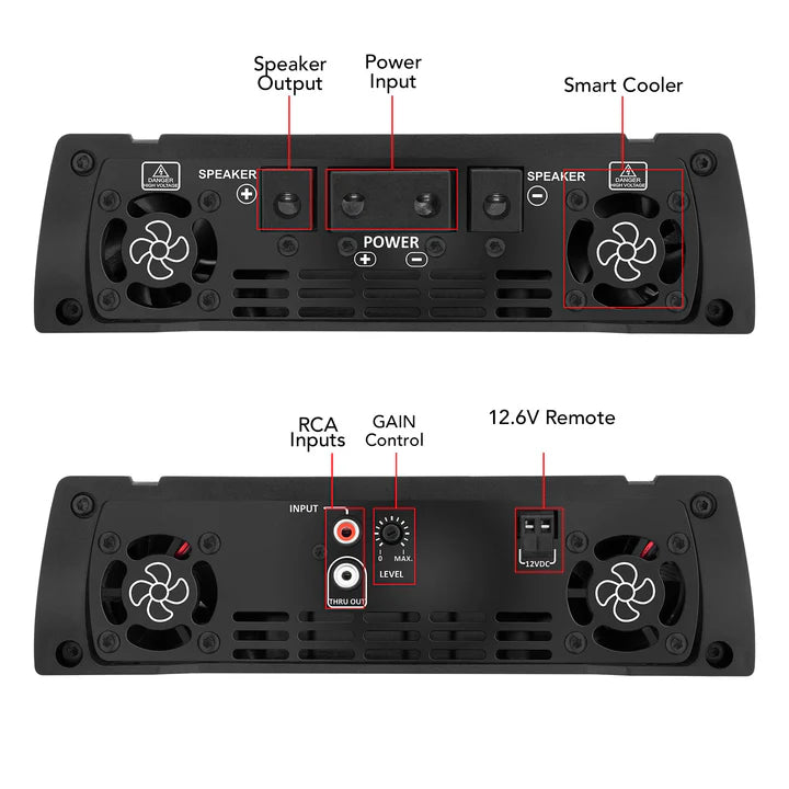 The amplifier has positive and negative output connector for speakers and positive and negative power input for high voltage.