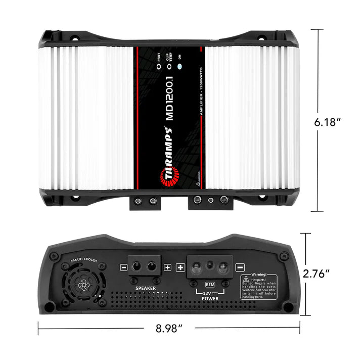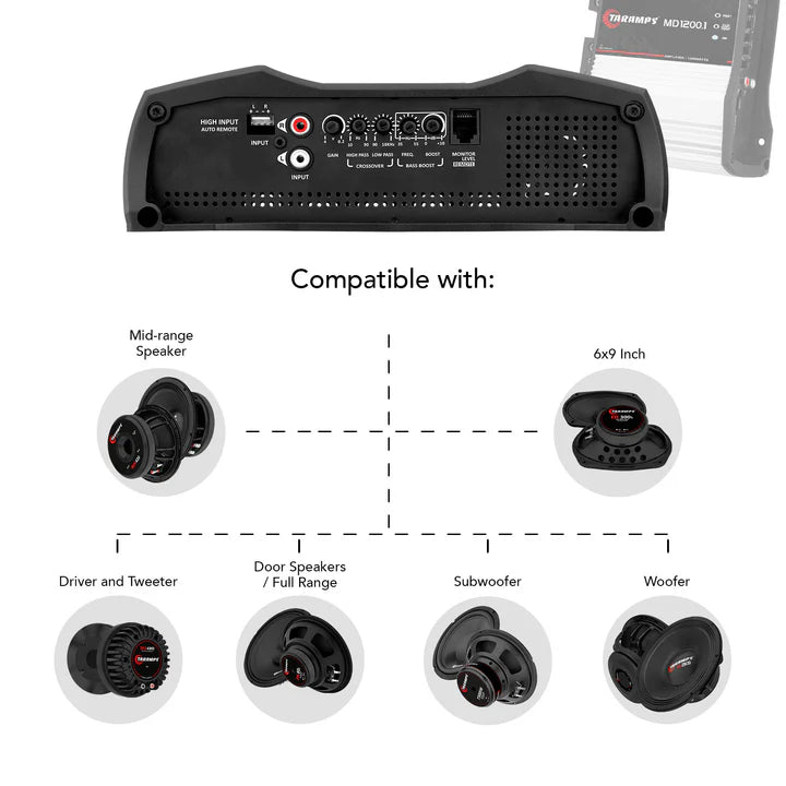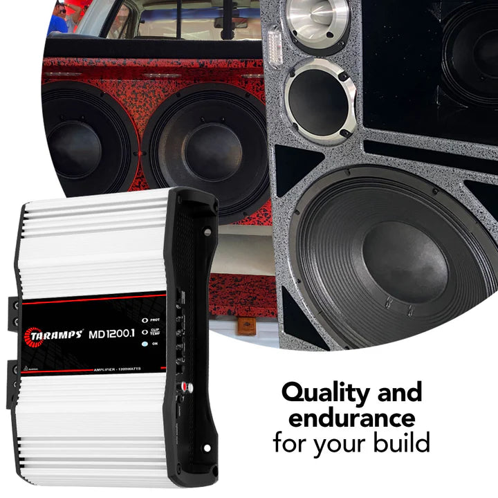 The Taramps MD 1200.1 at the 1, 2 or 4-ohms version has been carefully designed with the highest technology, offering high efficiency and performance for various types of car audio systems. This amplifier covers the whole frequency range, that is, it is a FULL RANGE module. It is classified as mono and has a channel with a maximum power of 1200-Watts RMS. Welcome to Taramps audio world.