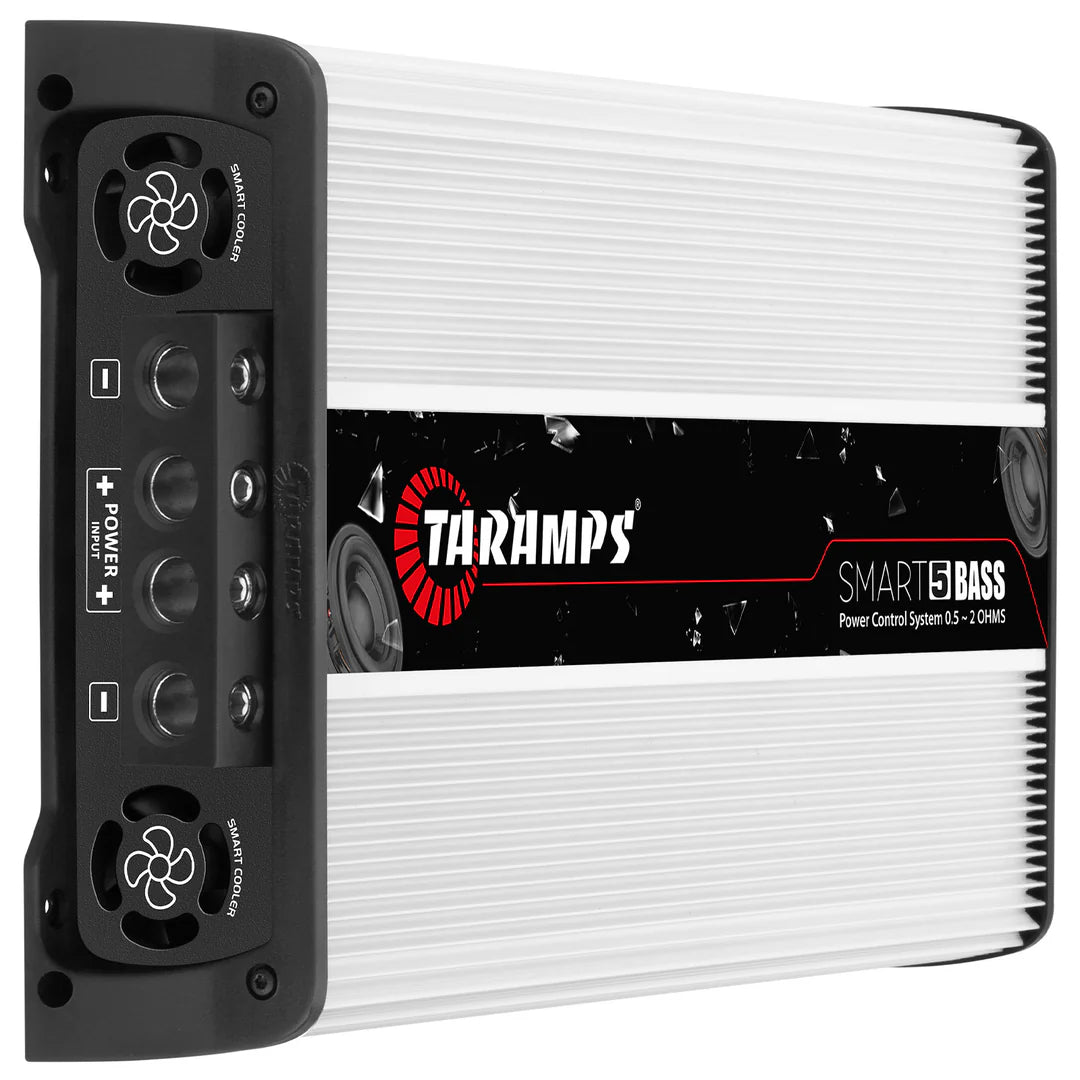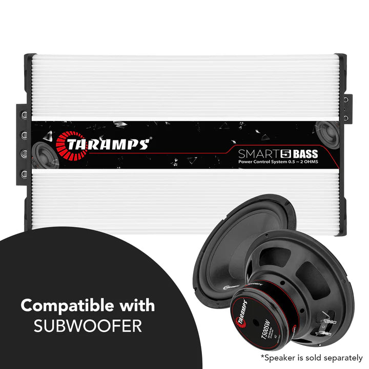 Experience unmatched bass with the Taramps Smart 5 BASS amplifier, designed specifically for subwoofers. This powerhouse delivers 5000 WRMS across 0.5 to 2 ohms and features the exclusive Power Control System technology for optimal low-frequency quality and security. Equipped to handle up to 2 x 2/0 AWG cables and including a CLIP monitor output, it guarantees a profound bass experience.