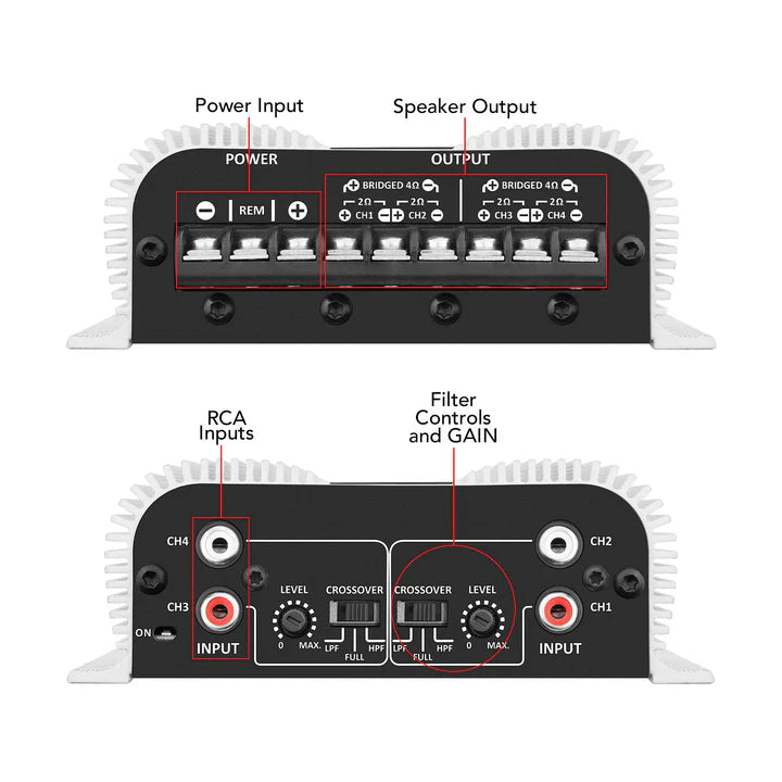 - Powerful multichannel amplifier adapts to various systems, compatible with: Door Speakers/ Full Range, Golf Cars, Motorcycles, Driver and Tweeter, Subwoofer, Mid-range.